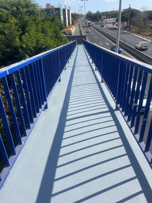 Pavimentación en 12 pasos elevados peatonales, realizando un lijado mecánico, y posterior aplicación de Sistema Compotop, con la aplicación de una capa de mortero bicomponente epoxi, Epoxan, extendido de una capa de mortero sintético de alta concentración de resinas, Compotop y terminación del sistema con la aplicación de una capa de pintura bicomponente a base de resinas de poliuretano alifático, con estabilidad cromática a los rayos UV, Composol P.